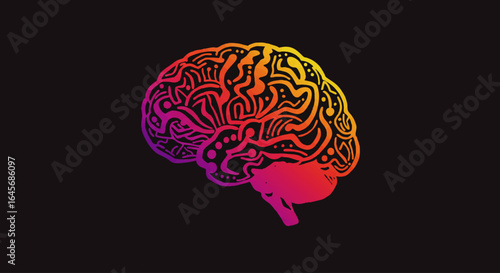 Stylized human brain illustration with a vibrant yellow to purple gradient and intricate abstract line patterns.