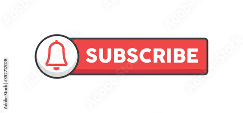 Subscribe red button with bell icon. Subscription to channel in social media. Flat style vector design.