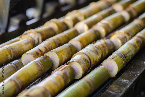 Sugar cane on conveyor belt in industry plant, Selective focus sugar cane harvesting for mass production industrial factory.