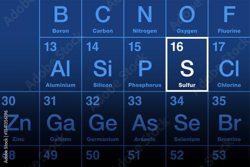 Sulfur element on periodic table. Nonmetallic chemical element with atomic number 16 and Symbol S from Latin sulphur. Essential for all life in form of organosulfur compounds or metal sulfides. Vector