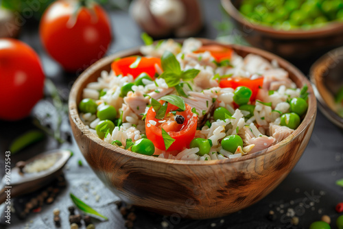 summer food cold rice salad with tuna green pea and tomatoes, selective focus