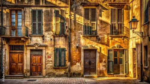 Sun-Drenched Old World Alleyway Aged Buildings with Wooden Doors and Shutters, Casting Long Shadows on a Cobblestone Street