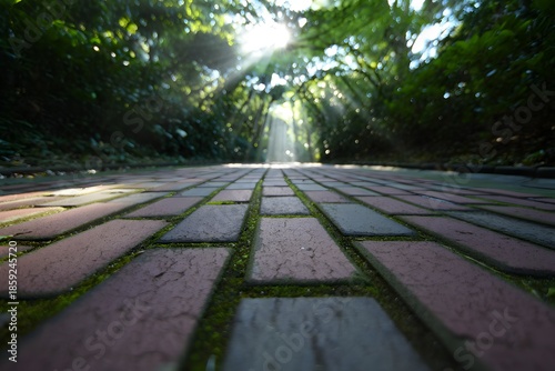 Sunlight filters through trees onto a tiled pathway covered in patches of grass