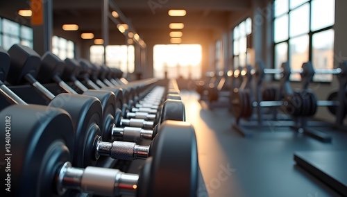 Sunlit Dumbbell Rack in Spacious Professional Gym