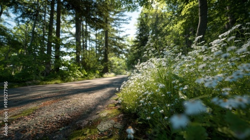 Sunlit Forest Road With Wildflowers, Evoking Serenity and Outdoor Recreation, Ideal for Travel Brochures and Nature Guides : Generative AI