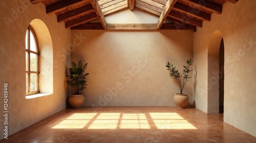 Sunlit interior with terracotta tile floor, arched windows, and wooden beams in a calm and peaceful room