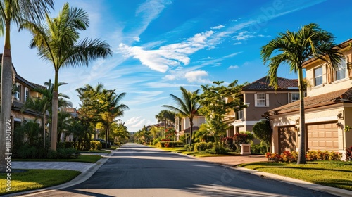 Sunny Florida Subdivision: Gated Community Houses and Palm-Lined Streets