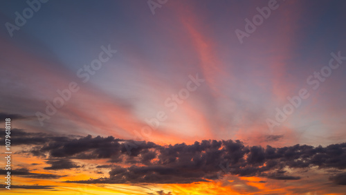 Sunset background. Dramatic majestic scenery sunset. Sky with clouds in sunset sky light background. Sunrise with clouds in various shapes. Calm sunset sky and sun through clouds over.