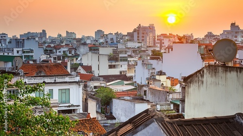 Sunset cityscape, Asian city rooftops, aerial view, travel