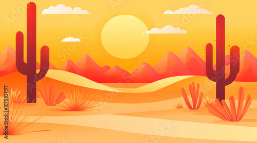 Sunset over a desert landscape with two cacti, sand dunes and mountains.