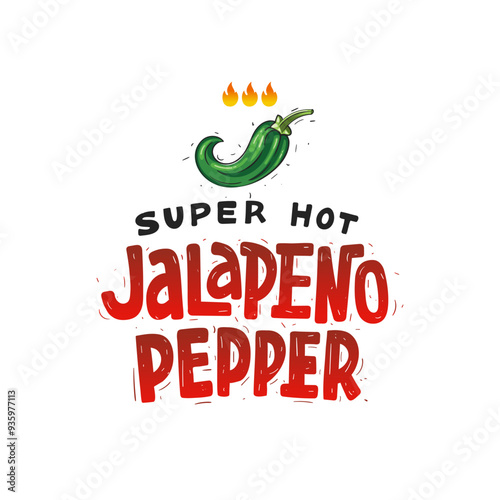 Super Hot Jalapeno Pepper. Green chili sketch illustration and flames. Hand draw lettering text. Template design for spicy food branding and packing