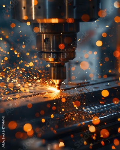 Super realistic CNC machining in a manufacturing factory, metal parts being cut, detailed and precise, sparks flying, advanced technology, hightech and efficient