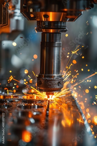 Super realistic factory scene with CNC machining, metal being precisely cut, detailed and intricate, bright sparks, advanced machinery, efficient manufacturing