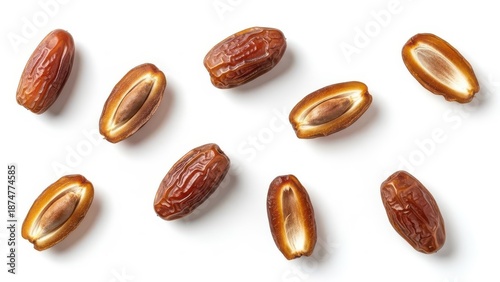 Sweet, rich brown dried dates, scattered whole and halved to show the seeds, captured in a clean overhead studio shot isolated on white.
