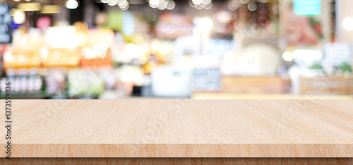 Table and blur background, Wooden counter over blur bokeh light background, Brown wood table top, shelf for food and retail shop, store product display backdrop, banner, mockup, template