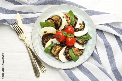 Tasty salad with grilled vegetables and mozzarella cheese served on white wooden table, flat lay