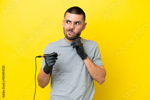 Tattoo artist caucasian man isolated on yellow background having doubts and thinking