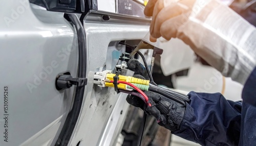 Technician skillfully connects wiring system inside of vehicle door panel precisely