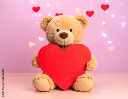 Teddy bear holding a large red heart against a soft pink background.
