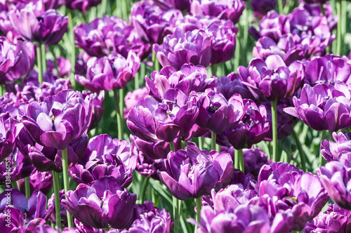 Terry purple tulips in a flower nursery. Background