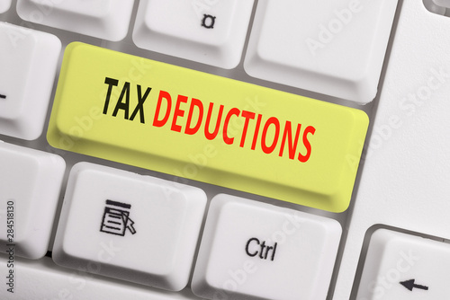 Text sign showing Tax Deductions. Business photo showcasing an amount or cost that subtracted from someone s is income White pc keyboard with empty note paper above white background key copy space