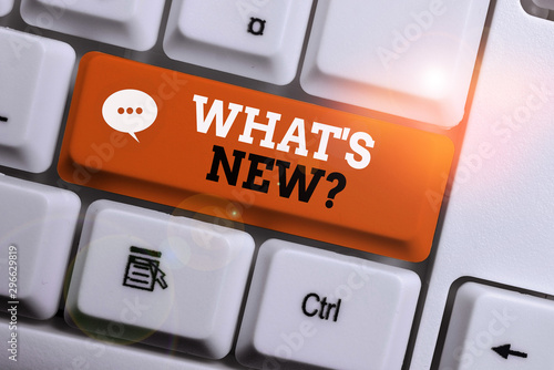Text sign showing What S New Question. Business photo showcasing when you ask someone about his current live events actions White pc keyboard with empty note paper above white background key copy