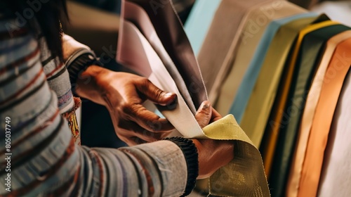 Textile designer selecting fabric swatches, close view of hands and colors, clear focus, studio lighting.