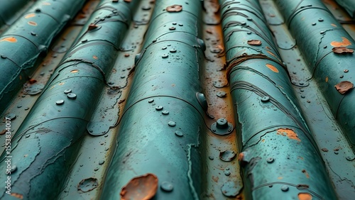 Textured metal roof with water droplets, showcasing a blend of nature and industrial design elements.