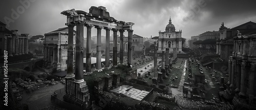 The Ancient Roman Forum captured under a gentle rain, showcasing its historical architecture with