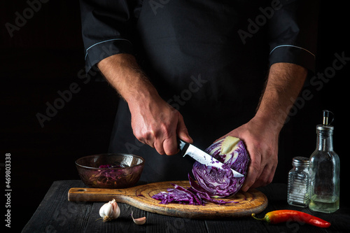 The cook is cutting red cabbage with a knife. Cooking vegetable salad in the restaurant kitchen. Vegetable diet idea.