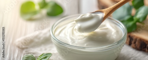 The creamy yogurt in a bowl with fresh herbs and wooden spoon.