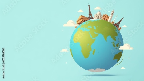 The globe is on a blue background, with wonders of the world around it. Green ecology travel concept. Earth Day. Clipart design flat isolated illustrations.