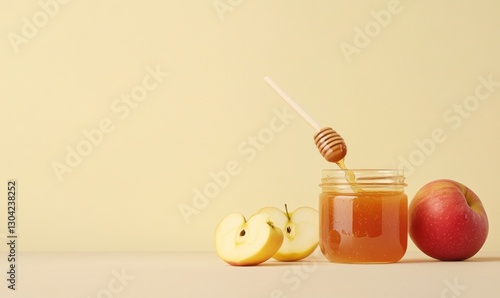 The jar of apple jam is placed on the table, and there's an open bowl with honey next to it. The glass lid has been used as a spoon for eating the apple jam in front of two apples
