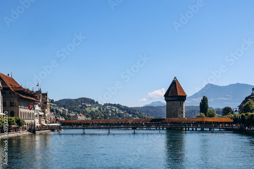 The Kapellbrucke (literally, Chapel Bridge), a covered wooden footbridge spanning the river Reuss diagonally in the city of Lucerne in central Switzerland