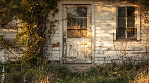 The old wooden door is painted white and is surrounded by overgrown plants. The door is in need of repair, the white paint is peeling.