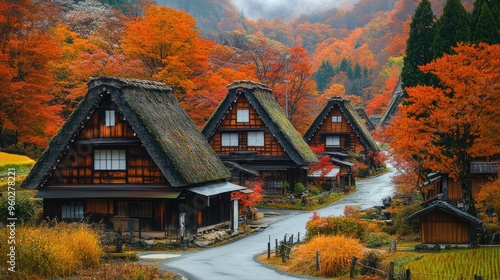 The picturesque Shirakawa-go in autumn, with the gassho-zukuri houses surrounded by colorful foliage.