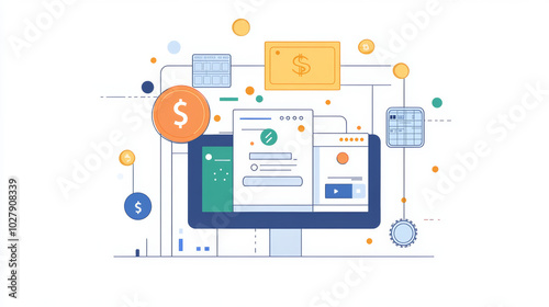 This illustration shows a digital money transfer happening online. It uses a modern design style with wireframe lines and colorful shapes.