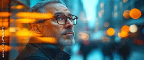Thoughtful Man Looking Up at City Lights