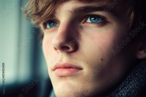 Thoughtful young adult looking away: calm expression, eyes focused off-camera, soft lighting, gentle background, introspective feel