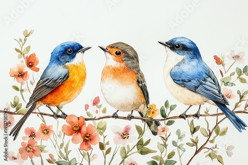 Three birds on flowering branch watercolor painting