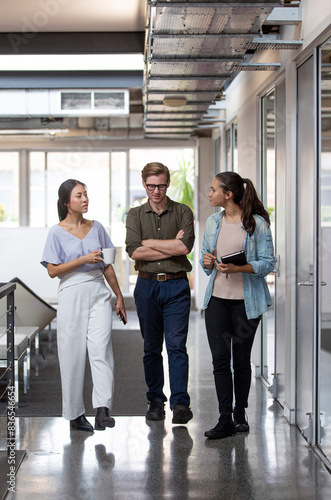Three businesspeople walking through office hall and talking