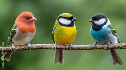 Three Colorful Birds Perched on a Branch