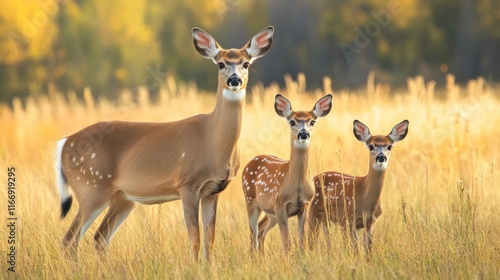 Three deer stand gracefully in a sunlit field, surrounded by tall grass and autumn hues.