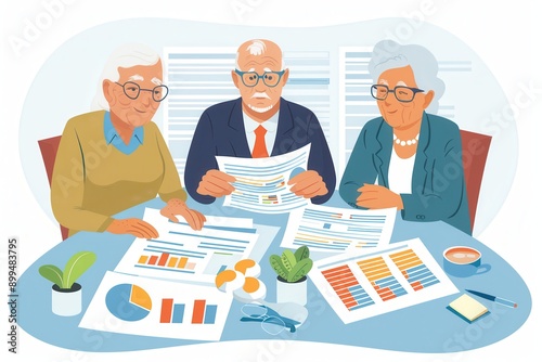 Three elderly individuals are discussing various charts and reports while seated around a table filled with papers and a cup of tea. Generative AI