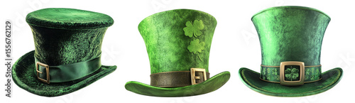 Three Green Hats with Shamrocks for St. Patrick's Day Celebration, PNG bundle collection, Isolated on Transparent Background