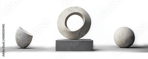 Three marble stone sculptures including a half sphere tilted on its edge, a hollow circular ring on a rectangular base, and a polished solid sphere on a white background