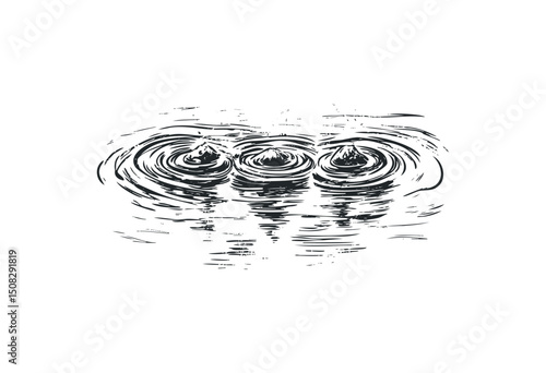 Three rippling water droplets creating concentric circles. Vector retro hand drawn illustration