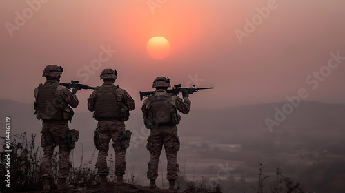 Three Soldiers Standing on a Hilltop at Sunset, Holding Rifles and Looking Out Over a Hazy Landscape