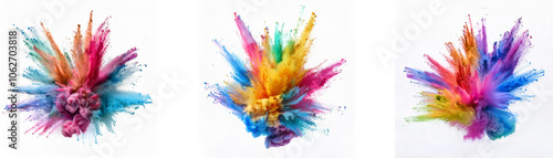 Three vibrant colored powder explosions isolated on a white background.