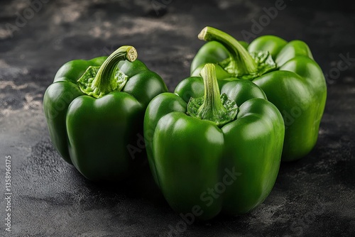 Three vibrant green bell peppers are grouped together elegantly